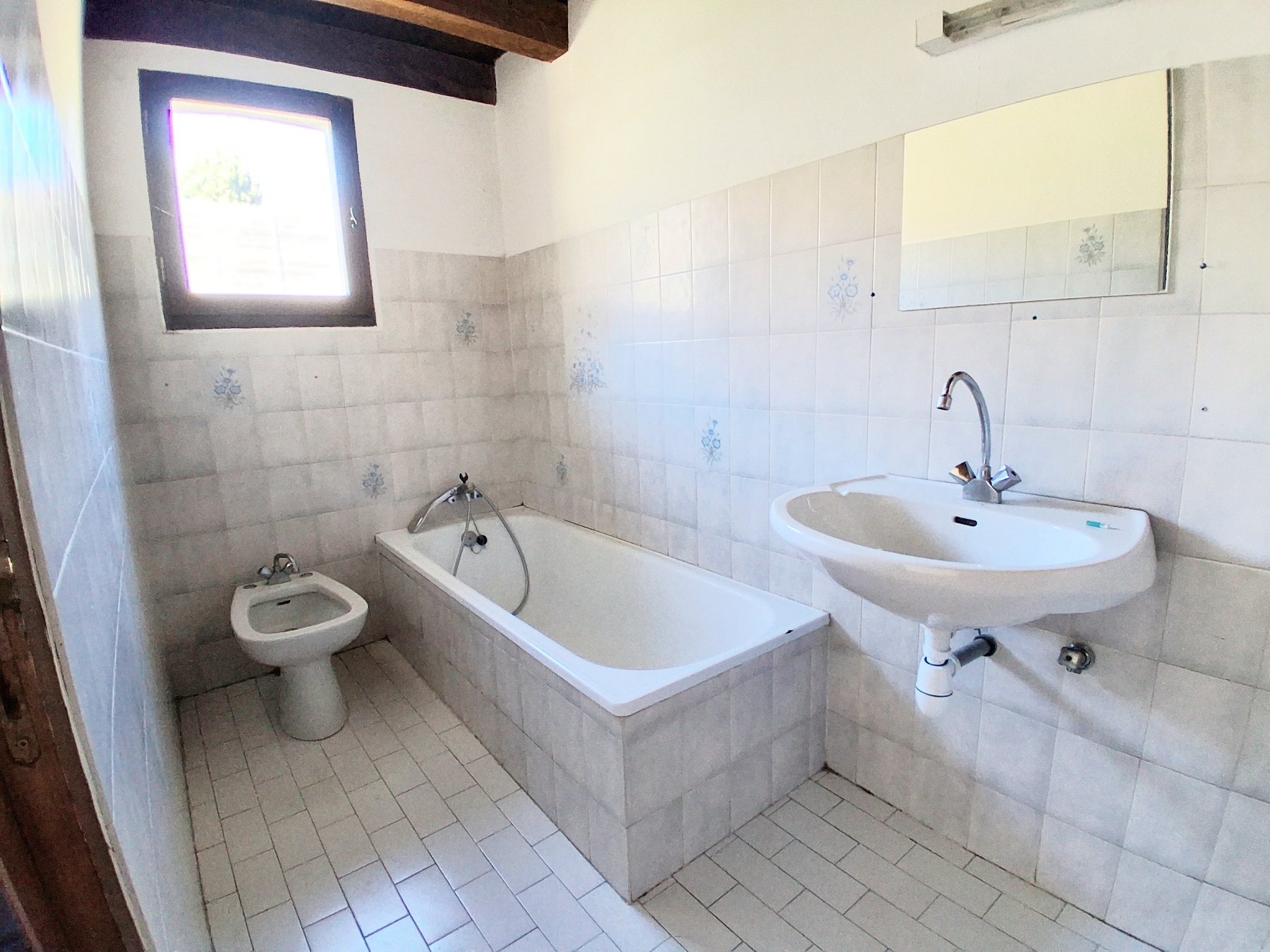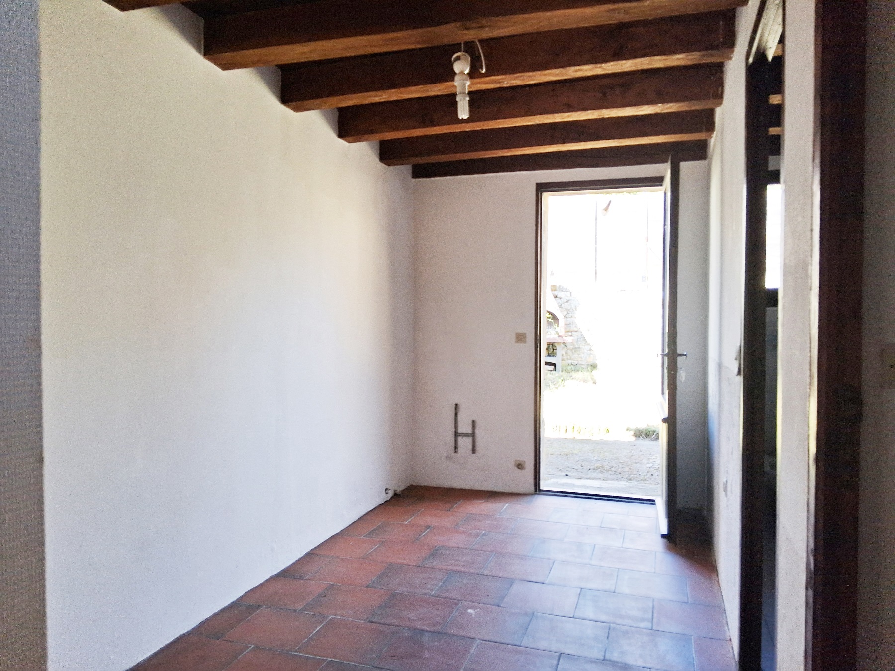 - Rez de jardin : un salon de 23m², cheminée ancienne, vieil évier, carrelage, fenêtre avec jolie vue. Une pièce chambre ou bureau de 8m², carrelage, porte – fenêtre sur jardin. Une salle de bain, et un wc indépendant