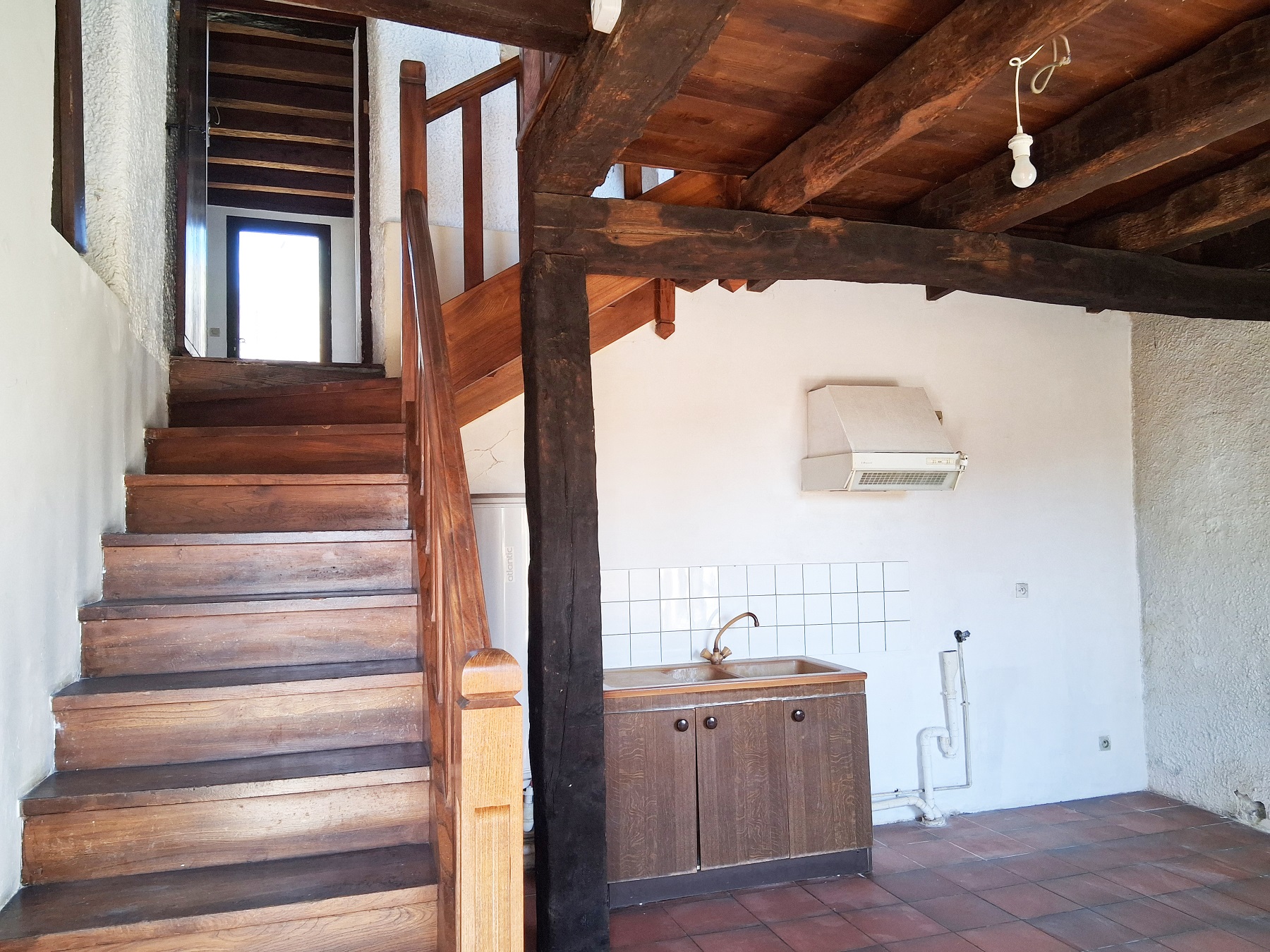 - Rez de rue : une pièce de 19m² env. avec escalier vers étage, carrelage, fenêtre